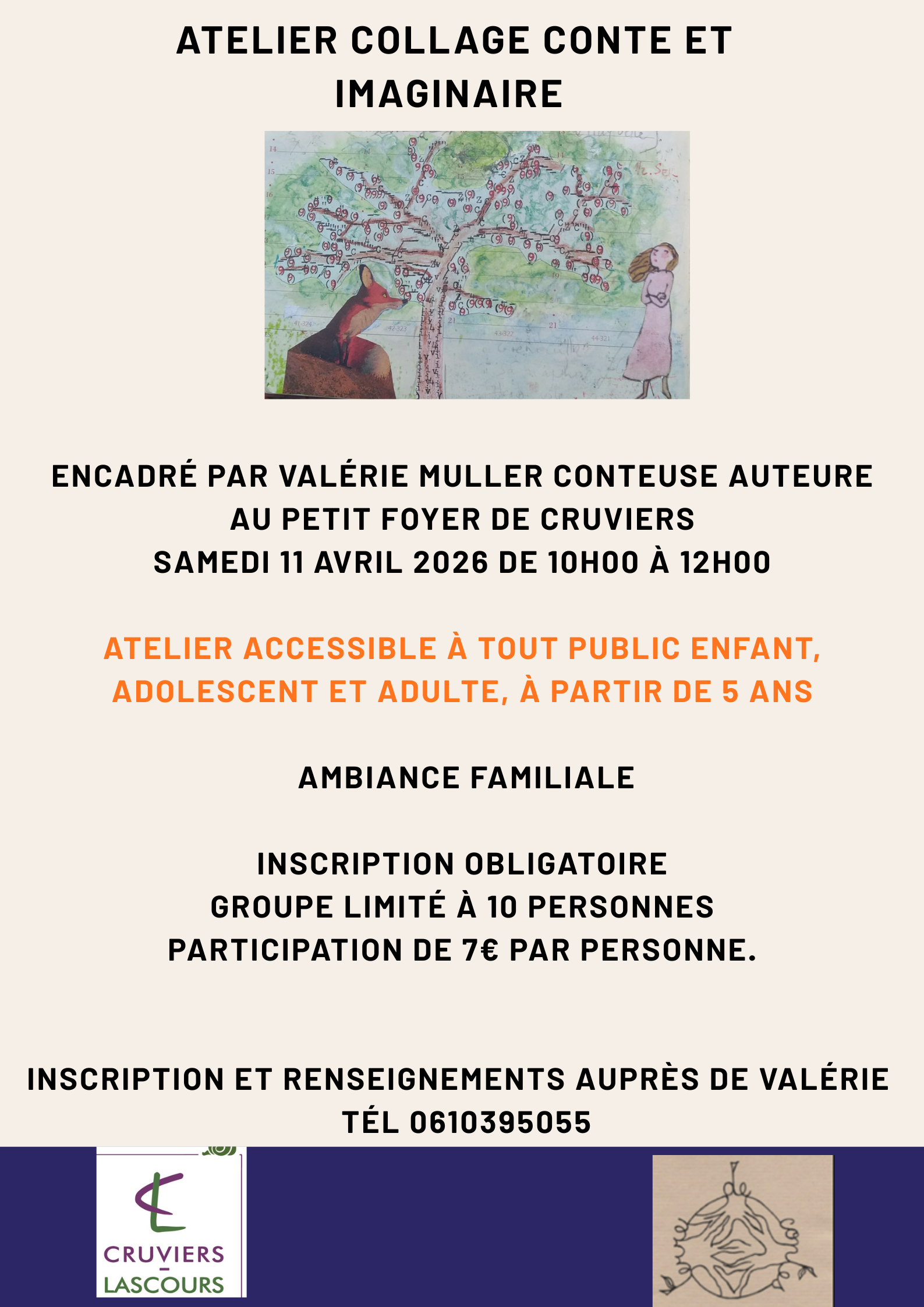 - Samedi 11 avril 2026 : Atelier Collage Conte et Imaginaire encadré par Valérie Muller conteuse auteure – Petit foyer de 10h à 12h – Inscription obligatoire et renseignements auprès de Valérie : 0610395055 – Participation 7 euros.